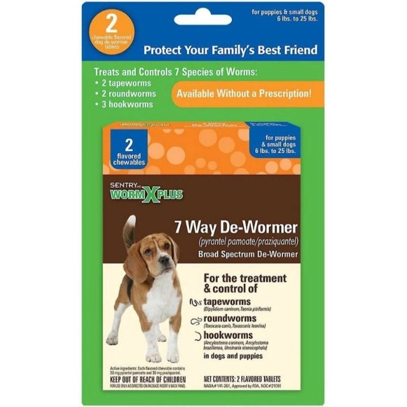 Sentry Worm X Plus is a 7-day broad spectrum de-wormer for dogs, available without a prescription. These chewable flavored tablets are formulated for fast treatment and control of tapeworms, roundworms, and hookworms in dogs and puppies.