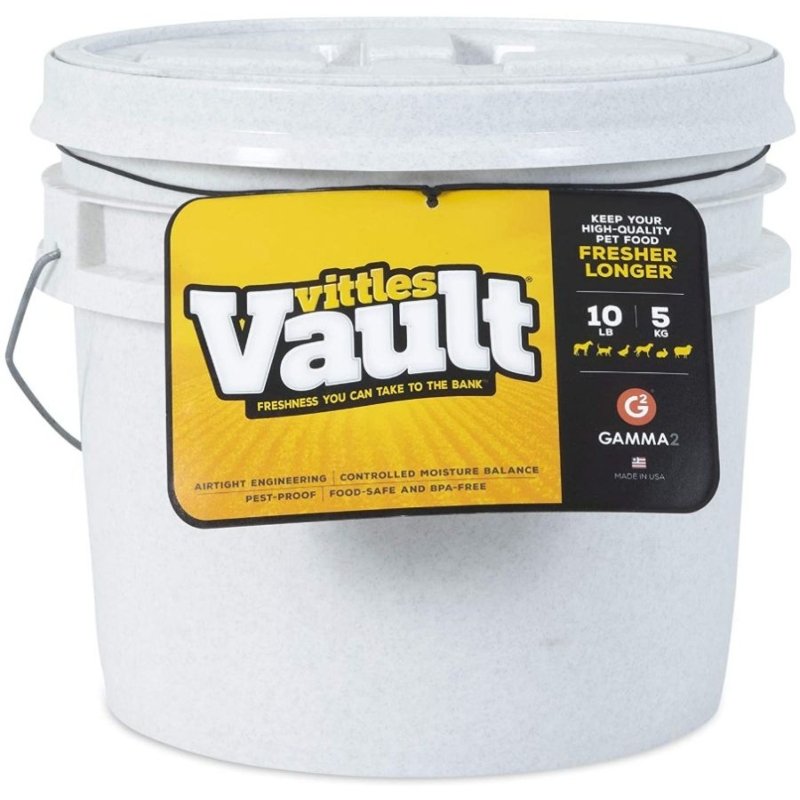 Gamma 2 Vittles Vault Airtight Pet Food Containers round buckets are the first complete storage system for dry pet foods. No more bulky, awkward bags exposing food to air, moisture, and unwanted pests with Vittles Vault Storage Containers.