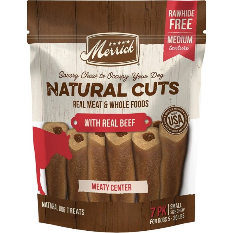 Merrick Natural Cuts are a NEW, rawhide free dog treat designed to occupy your dog with no staining, splintering, or plastic. Made with natural ingredients like real beef and whole foods, these savory dog chews feature a meaty, chewy center your dog will crave.