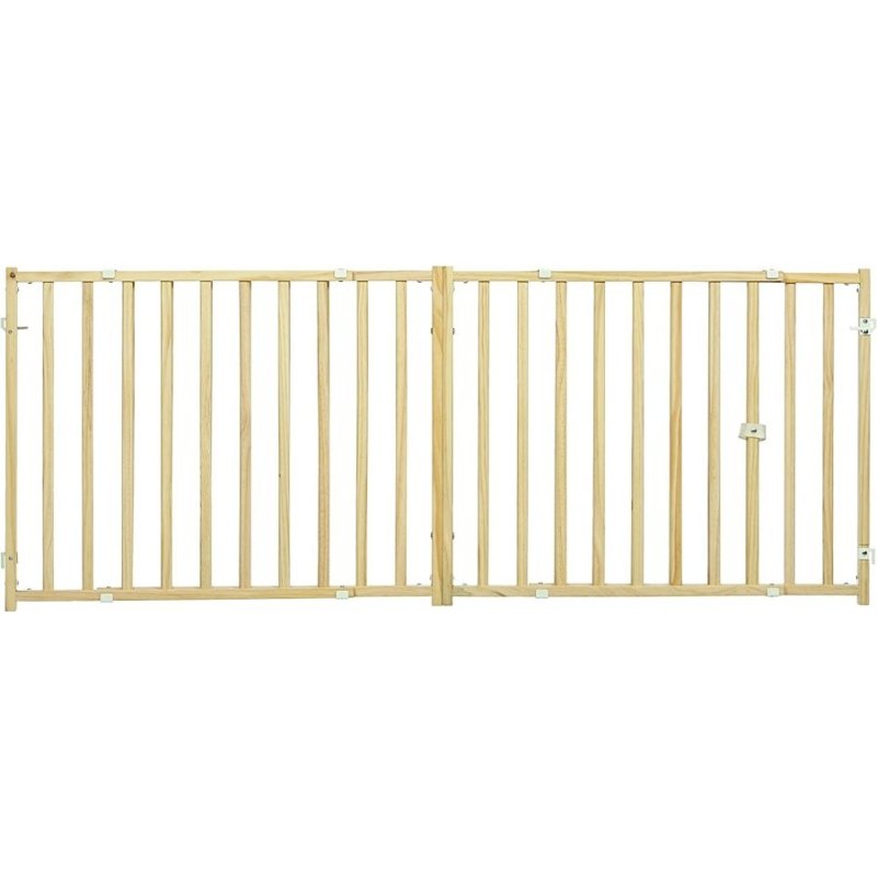 Specifically designed for the largest entryways, the Extra-Wide Swing Pet Gate keeps pets safely confined with easy walk-through access. The sturdy wood baluster gate is 24? tall and installs in minutes with hardware mounts and screws for extra durability. Two spring-loaded release latches attach to the wall and allow you to easily swing open the gate to walk through. The Extra-Wide Swing Pet Gate is expandable for a custom fit in any large door or entryway from 50.25? to 94? wide.