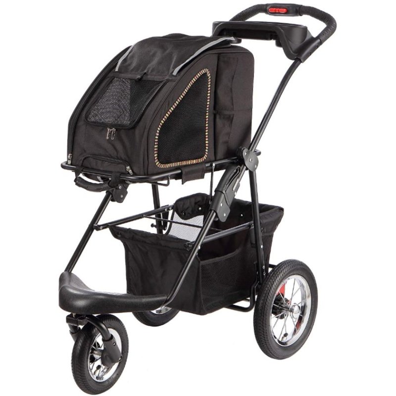 Four entryways: left side door, right side door, front mesh window with a magnetic flap covering, and top mesh window Petique's 5-in-1 Pet?Stroller Frame Durable Stroller Frame is made in the same manufacture as baby strollers. One-handed folding mechanism for a smooth and easy fold. Easy one-step dual brake for optimal safety. Quality stainless steel bike tires with shock absorption ensure a smooth ride. Large removable storage basket - holds up to 5 lbs. Removable Cup Holder Tray that holds up to 2 cups.