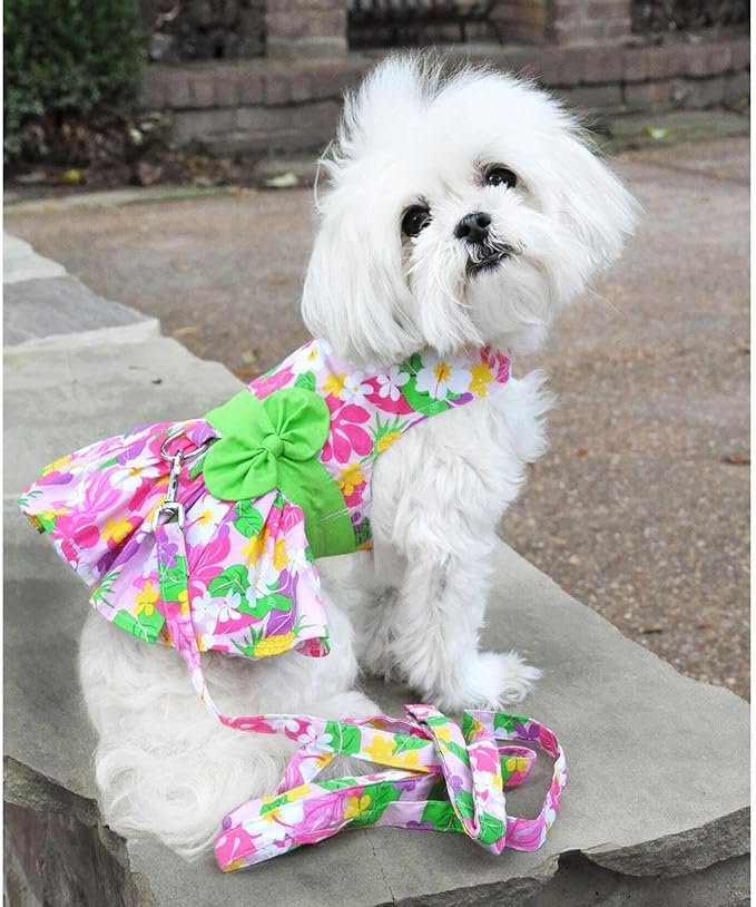 Pink Hawaiian Floral Dog Harness Dress with Matching Leash