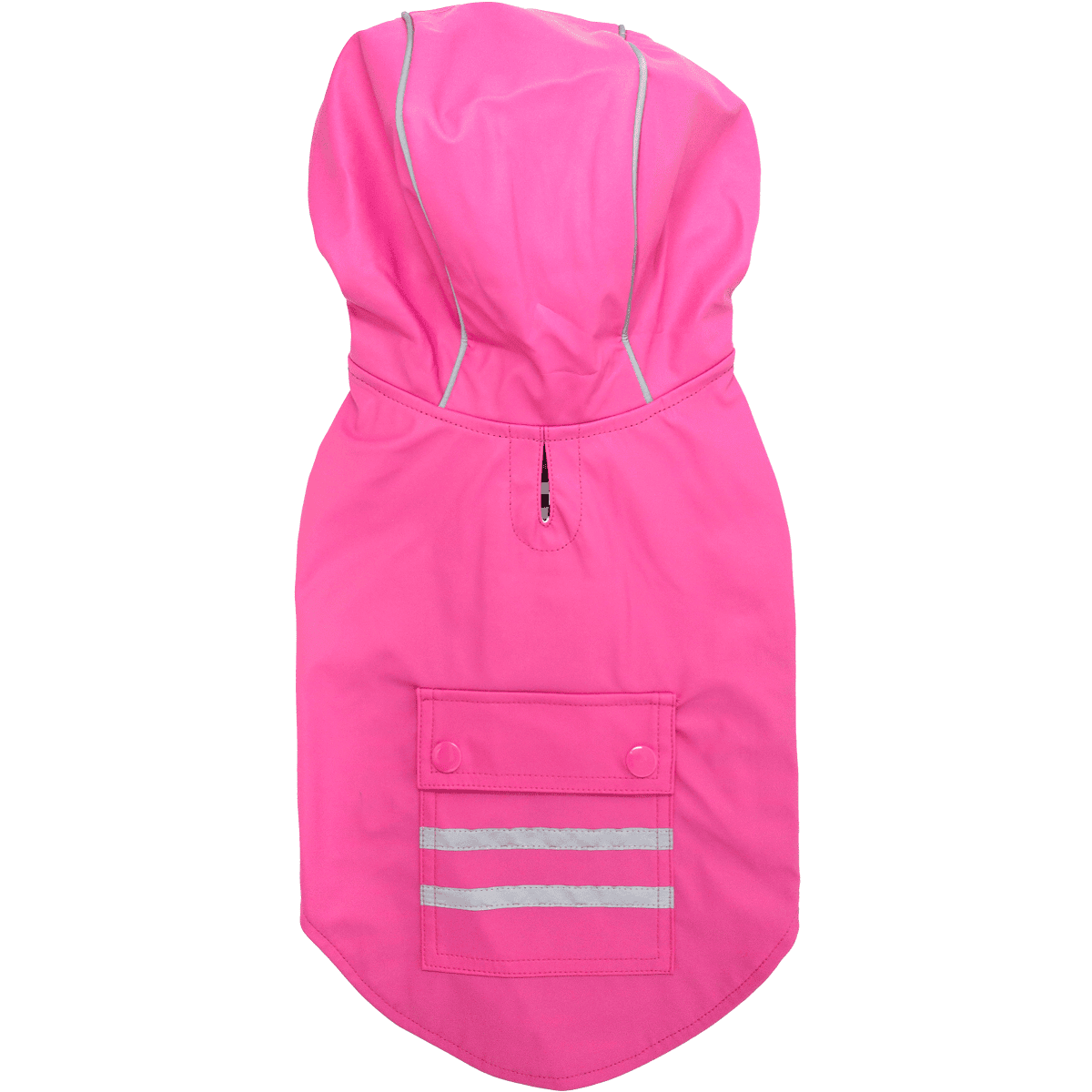 Our Slicker raincoats will have your pup happily splashing through puddles. Made of durable PU material, these raincoats are fun as well as functional. They feature a fashionable striped lining to keep your dog cozy and dry. Other features include a handy pocket on the back for keys or other small items and reflective striping on the pocket and hood to make sure your pup is noticeable, even in low light. These raincoats have a leash hole at the neck and an extra-wide closure along the belly to give your pup some room to grow.